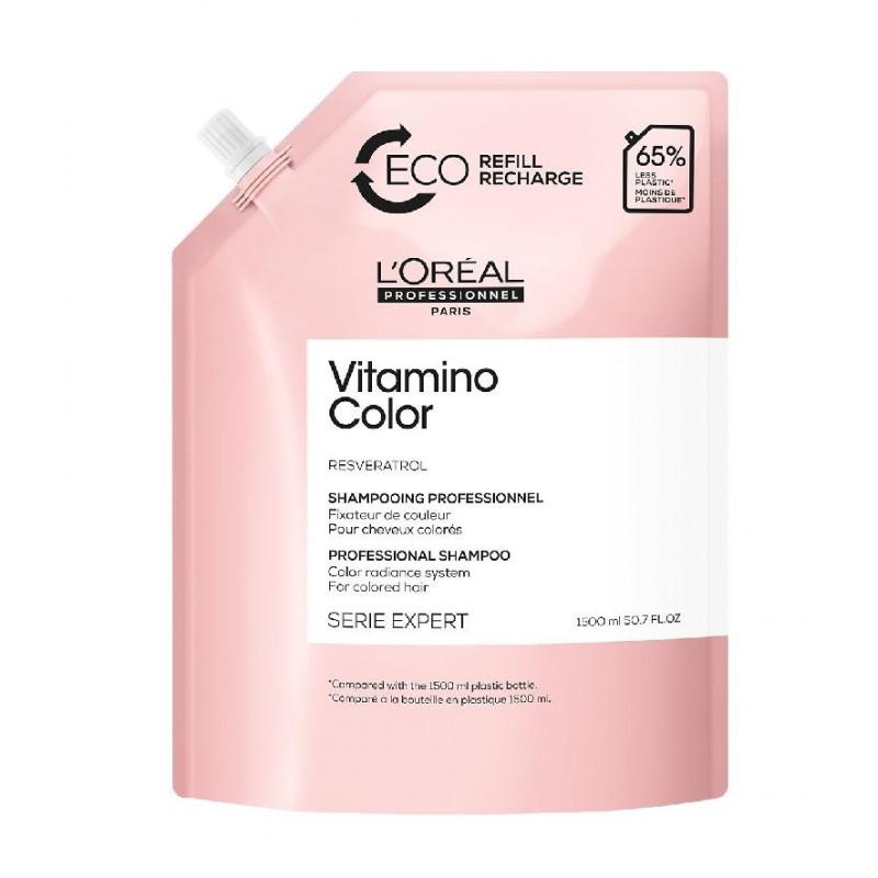Por primera vez disponible en un formato eco-recarga con un 65% menos de plástico que el formato botella actual de 1500ml, para un salón más sostenible. Este champú profesional limpia suavemente el cabello teñido protegiendo el color hasta 8 semanas*. El cabello teñido es 6 veces más brillante* y se ve más luminoso y radiante. El cabello se siente más ligero, manejable y suave. Fórmula enriquecida con resveratrol, un potente antioxidante para un cabello coloreado perfecto en el salón.