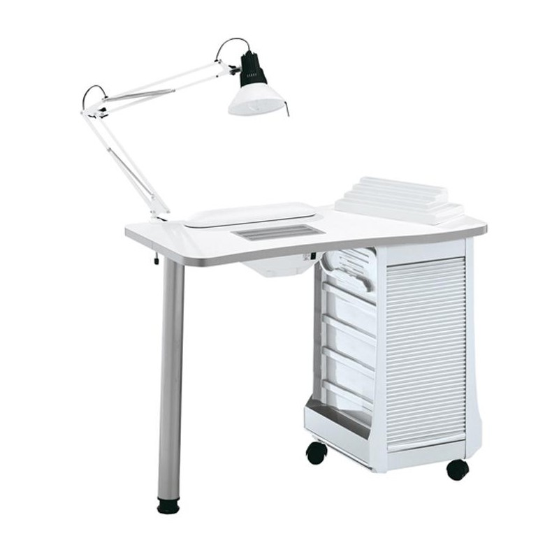 Mesa manicura compuesta de tablero en madera blanco, pie de aluminio y mueble termoconformado con ruedas. Incluye lámpara, espuma apoyamanos y un práctico organizador de útiles. Con aspirador 20W. Peso: 22kg. 74 x 48 x 98cm.